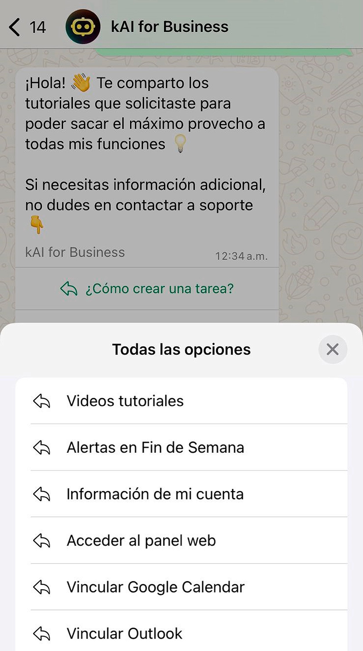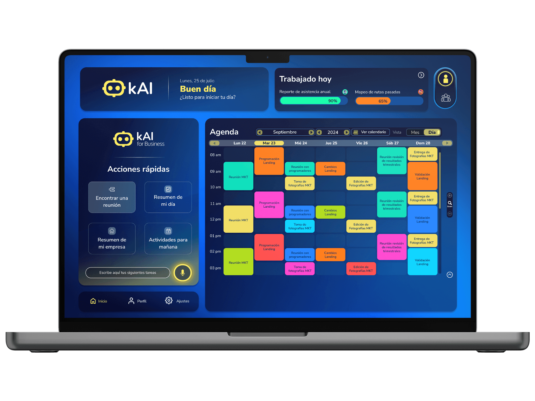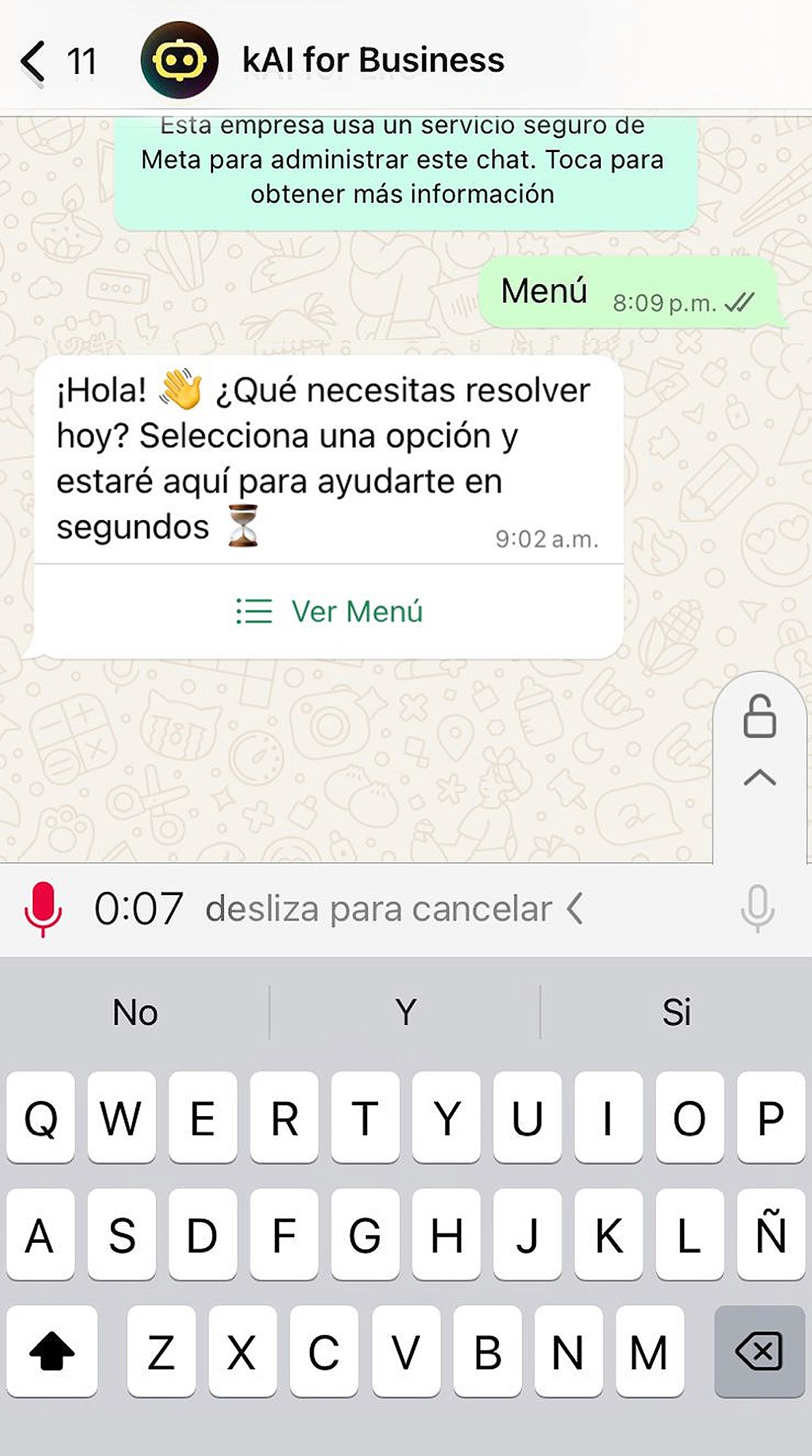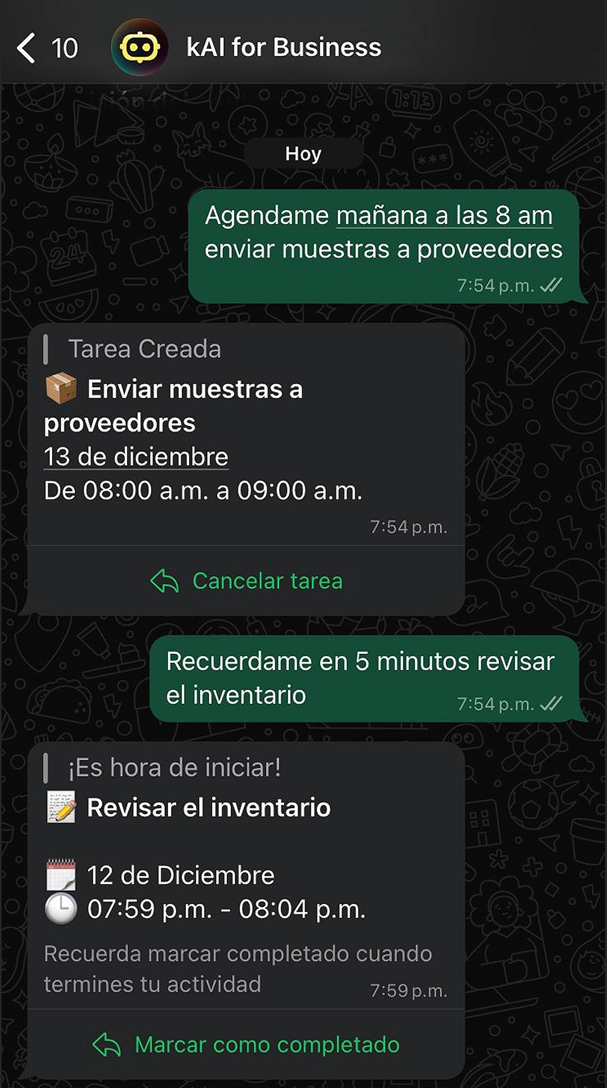 Con un mensaje o nota de voz desde WhatsApp. kAI se encarga de asignarlas al equipo y programarlas al instante.